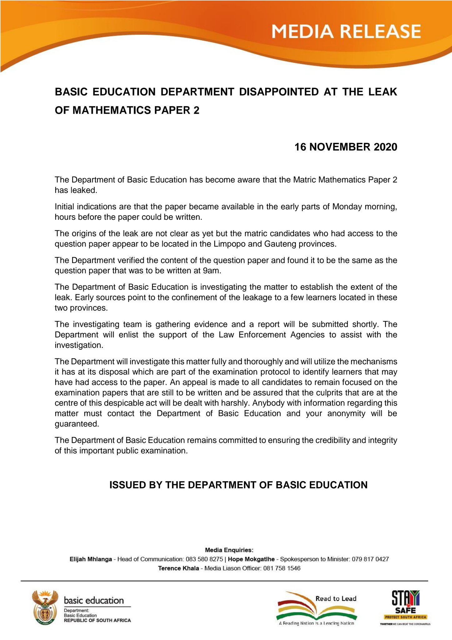 Dep Basic Education On Twitter The Department Of Basic Education Disappointed At The Leak Of Matric Mathematics Paper 2