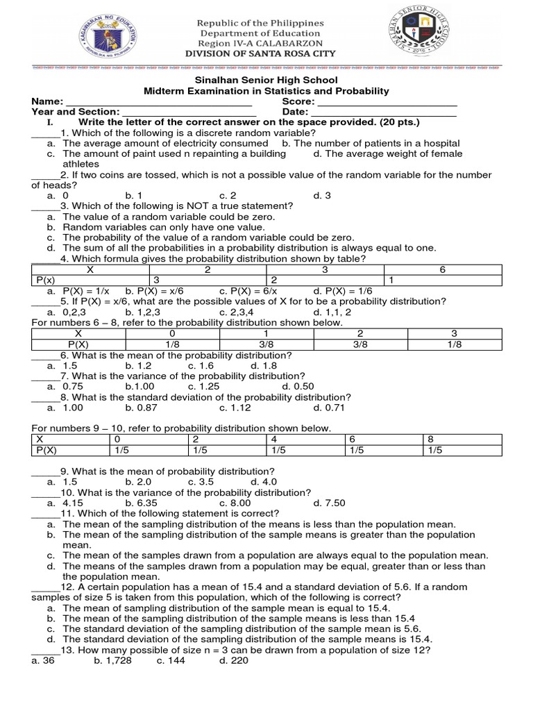 Midterm Exam In Statistics And Probability Grade 11 Variance Mean